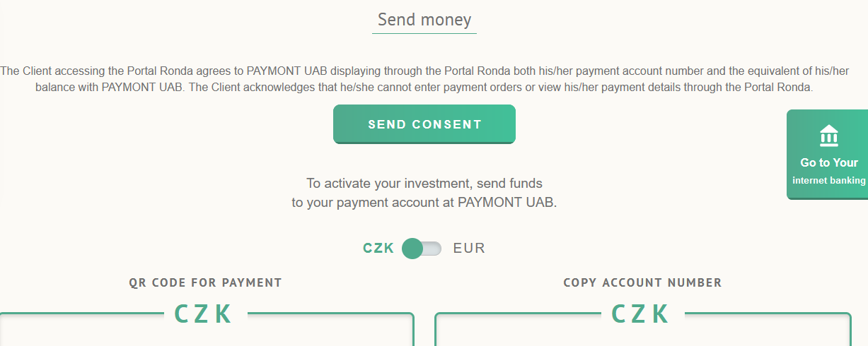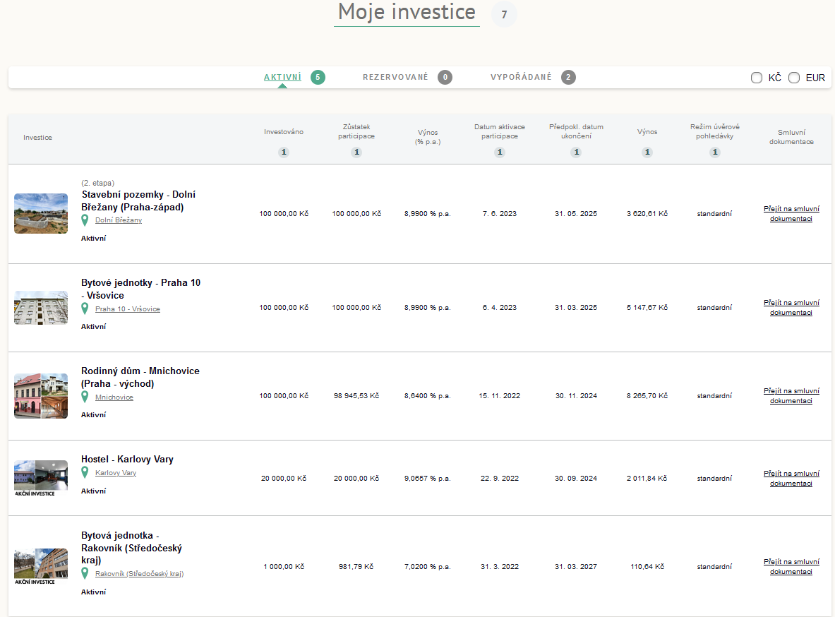 As you scroll down the page, you will find the “My Investments” section. This is a clear list of all your active, reserved, or settled investments that you can click through and review one by one. For each investment, there is an activation date and an expected end date. Once again, you can categorize your investments into CZK and EUR in the right-hand corner.