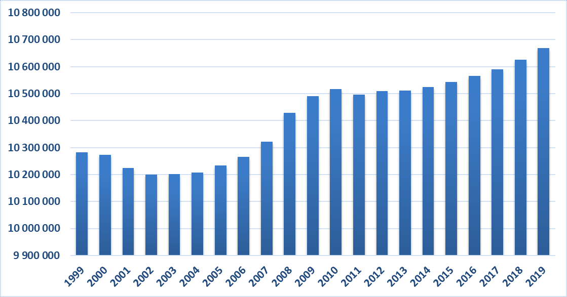 Vývoj počtu obyvatel v České republice v letech 1999 – 2019