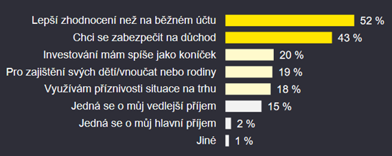 Nejčastějším důvodem Čechů k investování je právě snaha o dosažení vyššího zhodnocení úspor než na běžném účtu a dále také potřeba zabezpečit se na důchod – spíše tedy delší investiční horizont. Jako koníček považuje investování jen 20 % respondentů a 15 % si skrze investování buduje pasivní příjem.