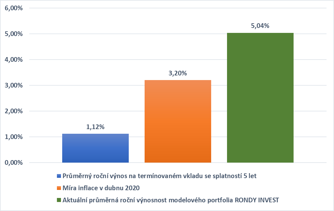 Graf výše znázorňuje srovnání průměrného ročního výnosu pětiletého termínovaného vkladu, míry inflace z dubna 2020 a ročního výnosu modelového portfolia u RONDY INVEST.