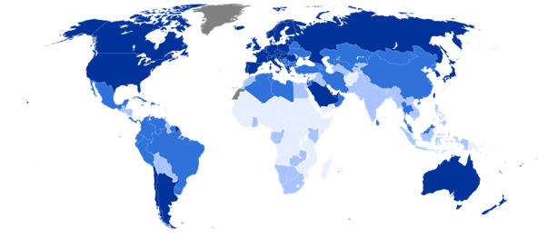 Mapa světa dle vyspělosti ekonomik – měřeno dle HDP na hlavu: