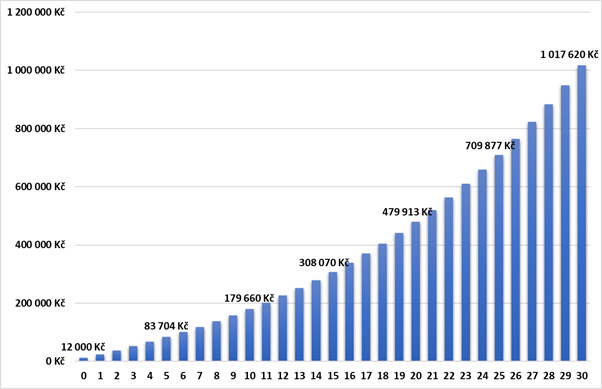 Vývoj investice ve výši 12 tis. Kč ročně se zhodnocením 6 % p.a.