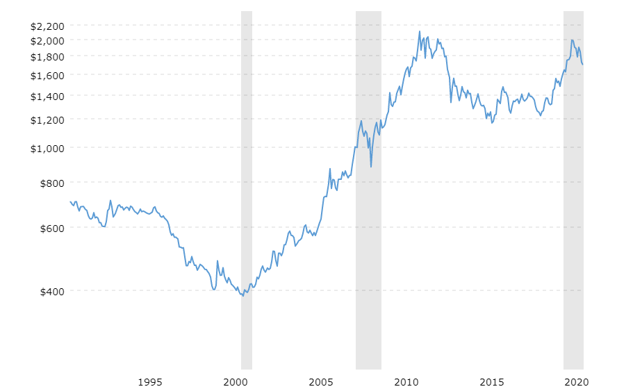 V letech 2020 dosáhla cena zlata historických maxim. Podívejme se ale na její vývoj v dlouhodobém měřítku a v porovnání s dalšími aktivy.