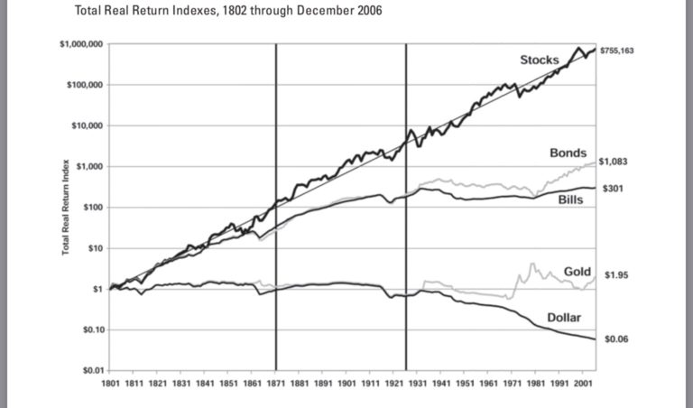 Americký profesor Jeremy Siegel postavil vedle sebe různé formy zainvestování jednoho dolaru v roce 1802 a vývoj jejich cen až do roku 2006, vše očistil o inflaci. Nejhůře dopadlo jednoznačně držení hotovosti, které i přes relativní stabilitu a sílu dolaru skončilo v mínusu. Zlato je hned v závěsu za ním, s odřenýma ušima v zisku na necelém dvojnásobku své hodnoty. S vývojem hodnoty akcií či dluhopisů je to zcela nesrovnatelně slabý výsledek. Navíc má jeho cena turbulentní vývoj.