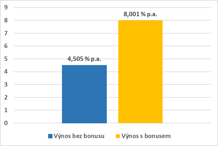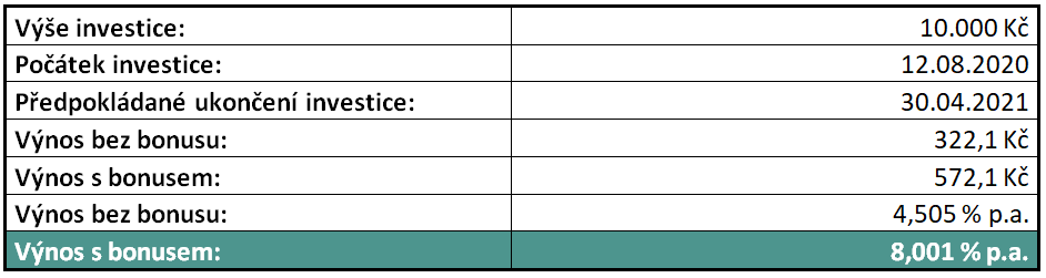 Výhody bonusu, který můžete získat, Vám podrobněji představíme na modelovém příkladu. Investice do úvěru Rodinné domy – Praha-Kolovraty II nese výnos 4,505 % p.a. Předpokládaná splatnost investice je 30.4.2021. V případě investice ve výši 10.000 Kč nyní ale navíc získáte akční bonus 250 Kč, takže dosáhnete výnosu 8,0 % ročně.