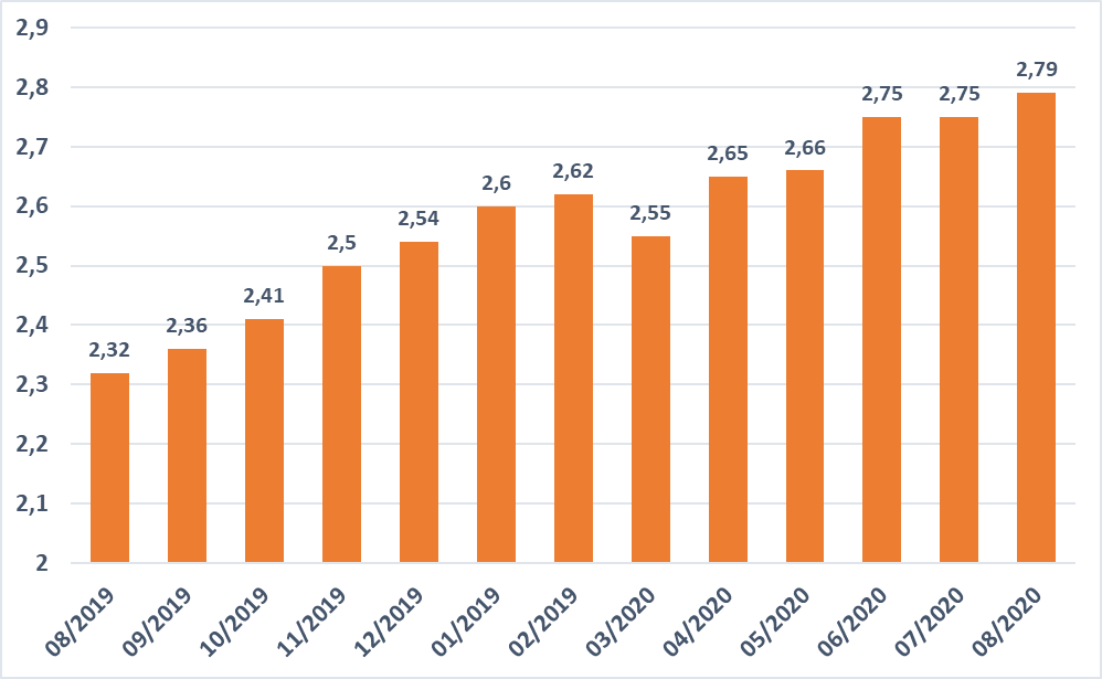 Vývoj průměrné výše hypotéky za poslední rok (mil. Kč)