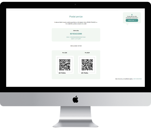 V Přehledu portfolia získáte rovněž informaci o aktuálním zůstatku vašeho účtu u RONDA FINANCE, takže snadno zjistíte, kolik máte volných prostředků pro další investice. Pokud si budete chtít zaslat na váš účet další prostředky k investování, stačí kliknout na zůstatek v horní části obrazovky a zadat platbu pomocí QR kódu. Stejně tak zde najdete údaje pro zaslání platby klasicky pomocí příkazu k úhradě. V pravém horním rohu této obrazovky máte možnost prokliku do vašeho internetového bankovnictví u RONDA FINANCE.