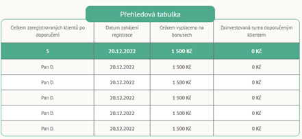 Pro ještě lepší transparentnost mají navíc investoři přehled o doporučených klientech ve svém profilu na Portálu Ronda při prokliku do záložky „BONUS ZA DOPORUČENÍ“ a následně do „Moje doporučení“ viz tabulka níže.