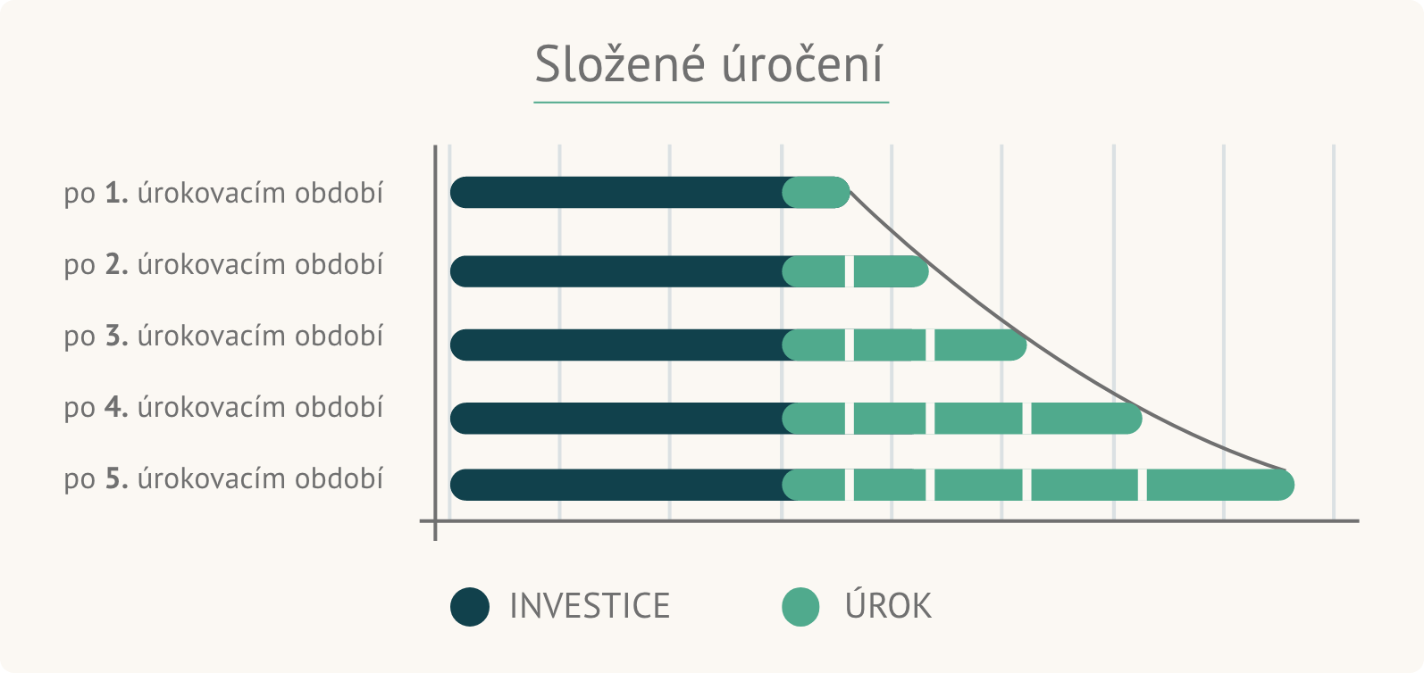Složené úročení znamená prakticky možnost získávat “úroky z již získaných úroků”, a tím roztočit investorské perpetuum mobile. Jinými slovy: Peníze samy vydělávají peníze, aniž byste museli vkládat další a další. Získaný úrok se na konci každého úrokovacího období přičítá k již dosažené hodnotě kapitálu a spolu s ním se dále úročí.