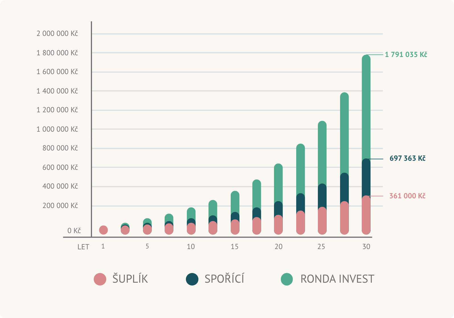 Každé procento navíc v čase hraje svou roli: celkový rozdíl ve výsledné sumě je téměř pětinásobný.