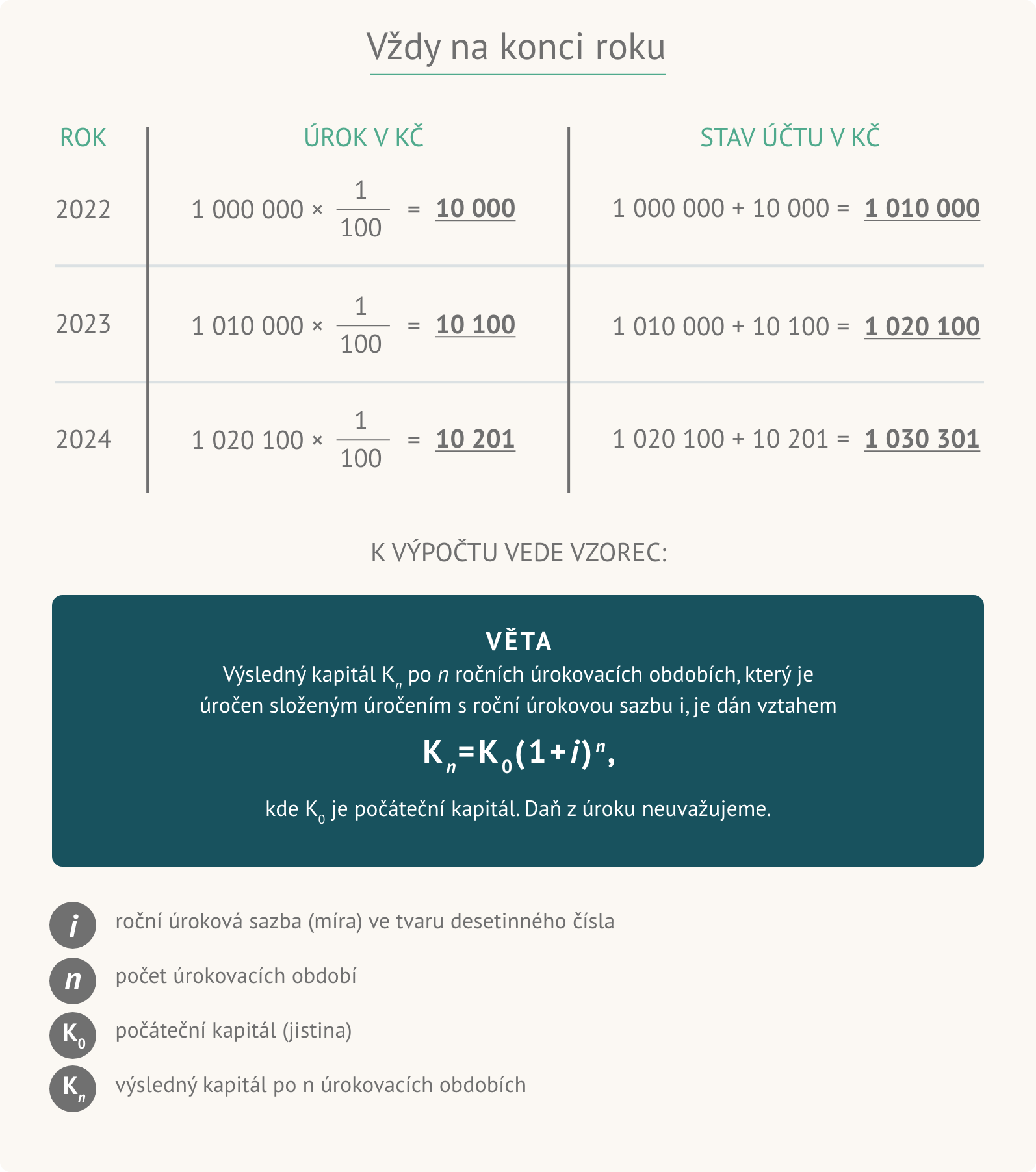 Na začátku roku 2022 vložíme 1 000 000 Kč na 3 roky na investorský účet, který generuje roční úrokovou sazbu 1 %, úrokovací období je 1 rok. Úrok se přičítá na konci každého roku k již dosažené částce. Neuvažujeme daň z úroku.