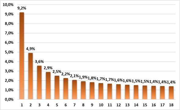 Pokud si budeme každý rok spořit částku 20 000 Kč, pak bude náš procentuální výnos ze stavebního spoření každým rokem klesat. V prvním roce dosáhneme díky státnímu příspěvku 2 000 Kč, po započtení úroku a odečtení poplatku stavební spořitelny zhodnocení přes 9 procent. V dalších letech však bude naše zhodnocení klesat, a to kvůli tomu, že naspořená částka poroste, ale státní podpora zůstává stále stejná. Pokud bychom si po 6 letech, kdy nám stavební spoření skončí, naspořenou částku vložili do nově založeného stavebního spoření a opět spořili každý rok částku 20 000 Kč, bude i nadále náš procentuální výnos každým rokem klesat. V případě tří po sobě jdoucích stavebních spoření se v posledních letech dostaneme na zhodnocení pouze na úrovni 1,4 procenta ročně. Vážený průměrný výnos za celou dobu spoření, tedy za 18 let, by v takovém případě i se započtením státní podpory činil pouze 1,76 procenta ročně. Takové zhodnocení ani nepokrývá inflaci, klesá za poslední rok a půl ani jednou neklesla pod hodnotu 2,8 procenta.