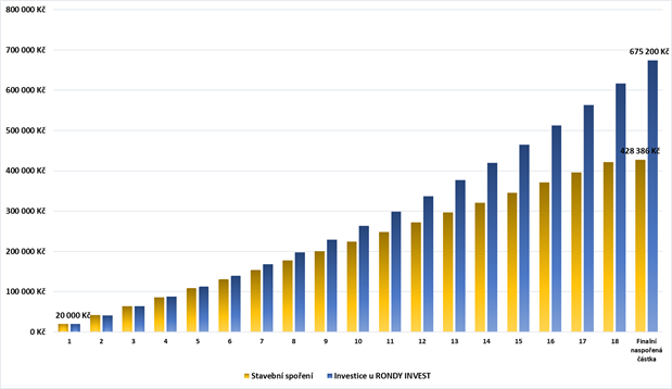 Na následujícím grafu je vidět, jak se vyvíjí celková naspořená částka v situaci, kdy si ukládáme každý rok na stavební spoření částku 20 000 korun. I přesto, že každý rok získáme státní podporu ve výši 2 000 Kč a úrok, dosahuje lepšího zhodnocení investice do realitního projektu u RONDY INVEST, u níž je kalkulováno rovněž s investicí částky 20 000 Kč vždy na začátku každého roku a zhodnocením 6 % ročně. Z grafu je zároveň patrné, že čím déle spoření trvá, tím větší je rozdíl mezi naspořenými částkami u jednotlivých variant. Po osmnácti letech uspoříme na stavebním spoření částku 428 386 Kč, kdežto prostřednictvím investice u RONDY INVEST se dostaneme na částku 675 200 Kč, která je více než o polovinu vyšší.
