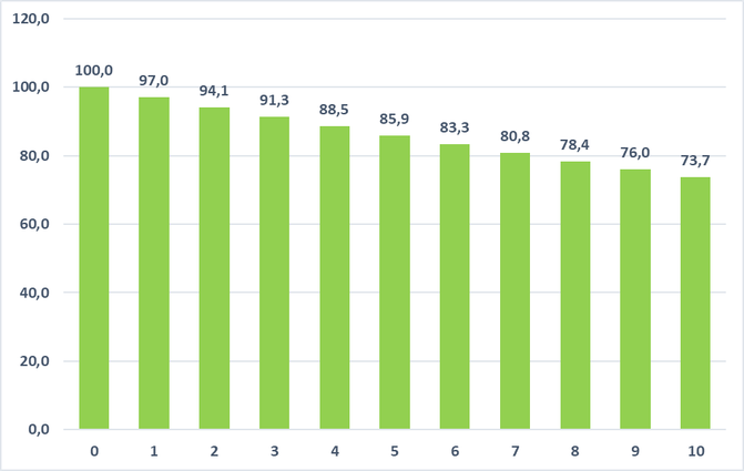 Modelová situace, jak se vyvíjí reálná hodnota peněz na účtu v bance v prostředí nulových sazeb a inflace ve výši 3 % ročně (počáteční hodnota vkladu = 100)