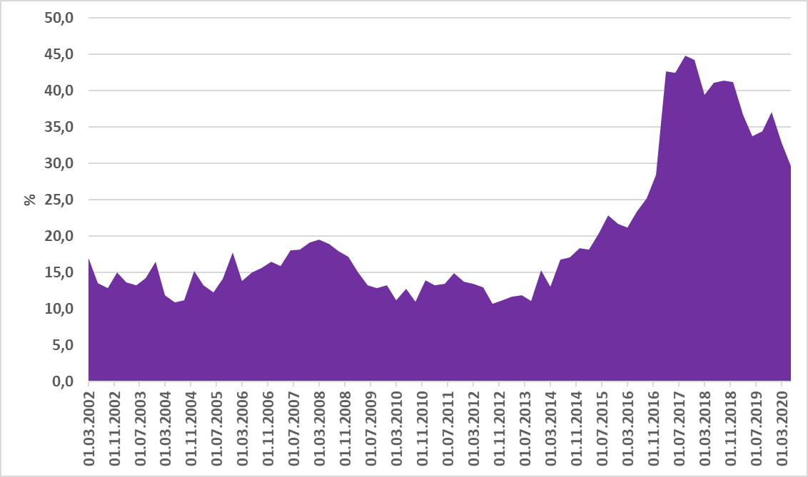 Podíl vkladů nerezidentů na celkových vkladech v bankách v České republice (v %)
