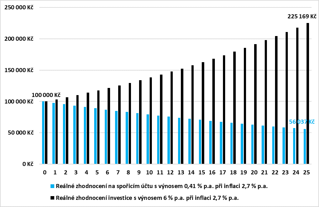 V hypotetickém případě, kdy by stávající podmínky na trhu zůstaly neměnné po dobu dalších 25 let, pak bychom za tuto dobu při uložení našich úspor na spořicím účtu v bance přišli téměř o polovinu z nich. Naopak v případě, že bychom volné prostředky investovali s výnosem 6 % p.a., pak za 25 let investovanou částku více než zdvojnásobíme. Výsledná částka získaná po 25 letech investování je tak čtyřnásobně větší než částka získaná uložením prostředků na spořicím účtu, jak je to vidět i na následujícím grafu. Tento zjednodušující příklad navíc nepředpokládá pravidelné přikládání drobných částek k počátečnímu vkladu resp. investici, které je však v praxi zcela běžné. V takovém případě by byl rozdíl mezi reálným zhodnocením prostředků na spořicím účtu a investovaných prostředků po 25 letech ještě výraznější.
