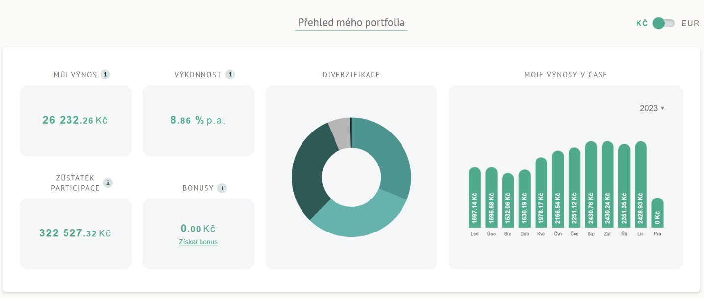 Automaticky se zobrazí náhled vašich korunových investic. Pokud máte ve vašem portfoliu eurové investice, u kterých si chcete přehled zobrazit, stačí přepnout tlačítko v pravém horním rohu z Kč na EUR.
